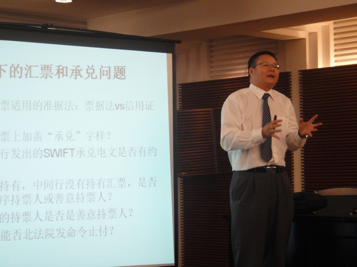 8月18日,北京银行业协会、对外经济贸易大学、市律协银行法律专业委员会在对外经济贸易大学宁远楼模拟法庭举办了“商业银行汇票承兑、贴现跨境银票保付加签业务的风险和防范”讲座。 本次讲座特邀吉林大学法学院博士生导师赵新华教授、本委员会金赛波律师分别作主题演讲,银监会、国资委、银行业代表及部分律师90余人参会。 在本次讲座中,赵新华教授从银行承兑汇票承兑风险、贴现风险以及相应风险防范方面结合案例进行了详细讲解;金赛波律师就跨境票据交易中保付加签业务的风险和防范中疑难问题予以剖析。与会人员积极互动,对实务中若干热点与难点问题进一步加深了认识,对下一期的实务讲座充满期待。