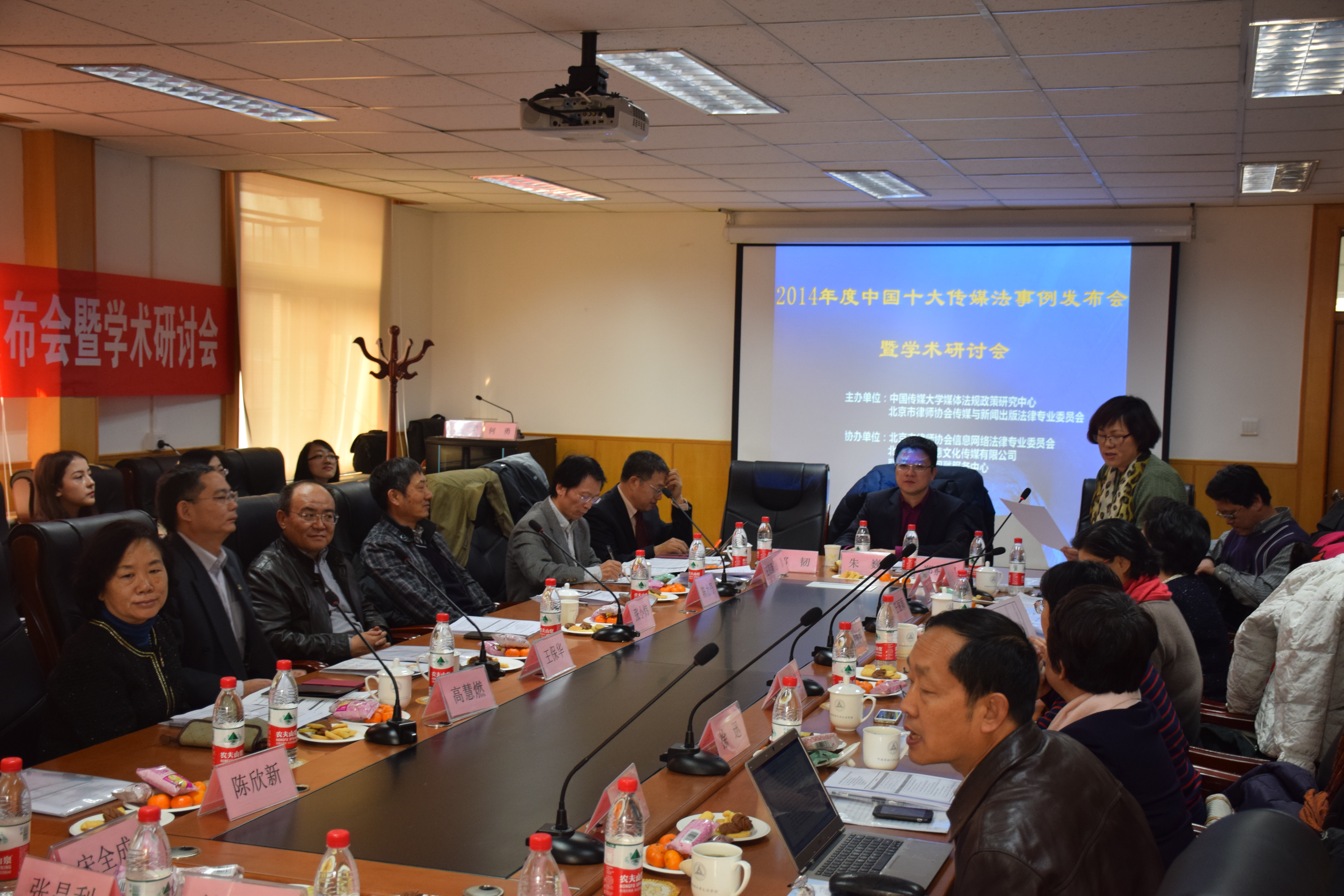 会上,传媒大学媒体法规政策研究中心主任李丹林教授公布了2014年度中国十大传媒法事例:一是腾讯公司诉奇虎公司不正当竞争案关联诉讼终审判决作出;二是世界奢侈品协会诉《南方周末》和《新京报》侵害名誉权案一审判决作出;三是中央成立网络安全与信息化领导小组;四是十二届全国人大常委会第八次会议批准《视听表演北京条约》;五是国家互联网信息办公室发布《即时通信工具公众信息服务发展管理暂行规定》;六是中央全面深化改革领导小组审议通过《关于推动传统媒体和新兴媒体融合发展的指导意见》;七是国务院授权国家互联网信息办公室负责互联网信息内容管理工作;八是21世纪传媒公司涉嫌敲诈勒索案;九是最高人民法院发布《最高人民法院关于审理利用信息网络侵害人身权益民事纠纷案件适用法律若干问题的规定》;十是琼瑶诉于正等侵犯著作权案一审判决作出。