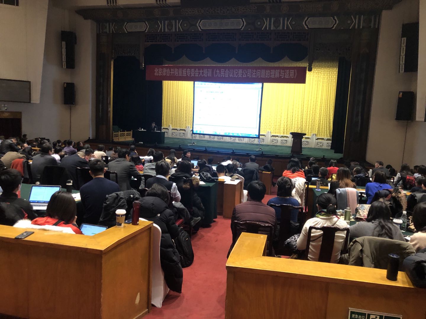 2019年12月8日上午,北京律协并购重组法律事务专业委员会在前门建国饭店梨园剧场举办了“九民会议纪要公司法问题的理解与适用”律师业务大培训。北京律协副会长赵曾海应邀出席会议并致辞。中国政法大学民商经济法学院教授、博士生导师、中国商法学研究会会长赵旭东做主题演讲。培训由赵继明主任主持,副主任黄英龙、副秘书长徐强及委员、律师500多人参加了本次培训。 赵曾海副会长在致辞中指出《全国法院民商事审判工作会议纪要》的出台对于统一裁判思路,规范法官的自由裁量权,增强民商事审判的公开性、透明度以及可预期性,提高司法公信力具有重要的意义。广大律师要准确理解和把握会议纪要的精神实质和基本内容,从而提升办案能力和执业水平。 赵旭东教授结合《全国法院民商事审判工作会议纪要》,就对赌协议的效力及履行、股东出资加速到期及表决权、股权转让合同的效力、公司人格否认、公司清算义务人的责任、公司为他人提供担保、股东代表诉讼等七个方面的问题进行了透彻的解读。通过赵旭东教授理论与实务贯通的系统讲解,与会律师纷纷表示受益匪浅。