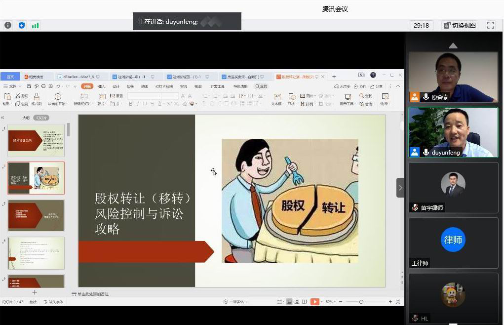 2020年9月25日晚上,第十一届永盈彩票公司法专业委员会(以下称“公司委”)以网络视频会议的形式举办了线上内部培训。培训由公司委副主任原森泰主持,由副主任杜云峰主讲,培训主题为《股权转让(移转)风险控制与诉讼攻略》,公司委主任张秀华及委员等四十余人参加了本次培训。 在本次培训中,杜云峰副主任结合律师实务,将公司法与合同法等部门法有机结合,详细的讲述了股权转让的七大风险,包括股权转让中的加速到期、股权转让中的对赌协议、股权转让中的夫妻有限责任公司、股权转让中的优先购买权、股权转让中的股东知情权、股权转让中的国有资产转让、股权转让中的股东抽逃出资等法律问题。杜云峰副主任对相关法律问题均引用了法院判例并阐释裁判要旨,对《九民纪要》中的相关规定也予以分析,对于律师实务中遇到的问题均进行了总结并给出必要的建议。最后,杜云峰副主任还讲述了股权转让纠纷的诉讼攻略,并与委员进行了互动交流。 整个讲座持续了两个多小时,加强了委员对专业问题的深入理解,达到了本次培训的预期,公司委还将继续开展此类的线上培训讲座。