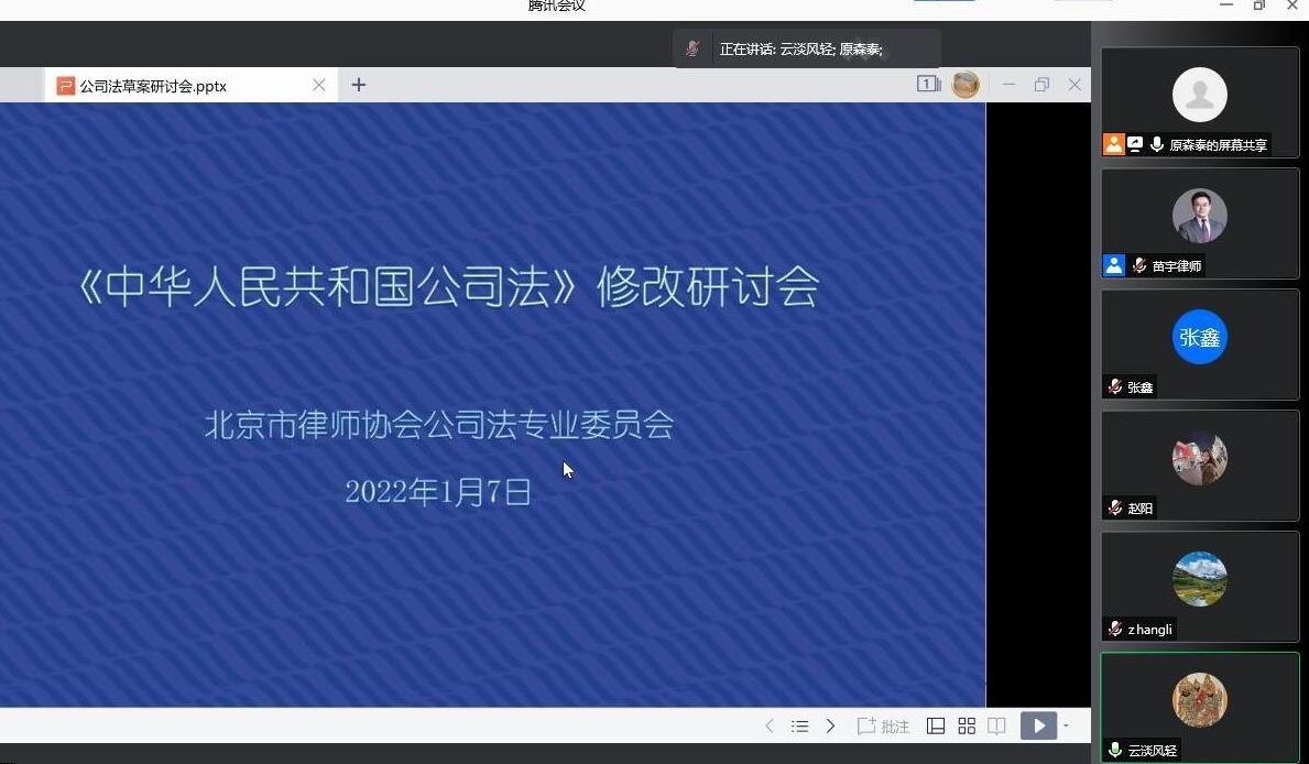 2022年1月7日晚,北京律协公司法专业委员会(以下称“公司委”)以线上和线下相结合的形式举办了《中华人民共和国公司法》修改研讨会,公司委主任原森泰(代)、副主任严涛及部分委员参加了研讨。研讨会由原森泰主持。