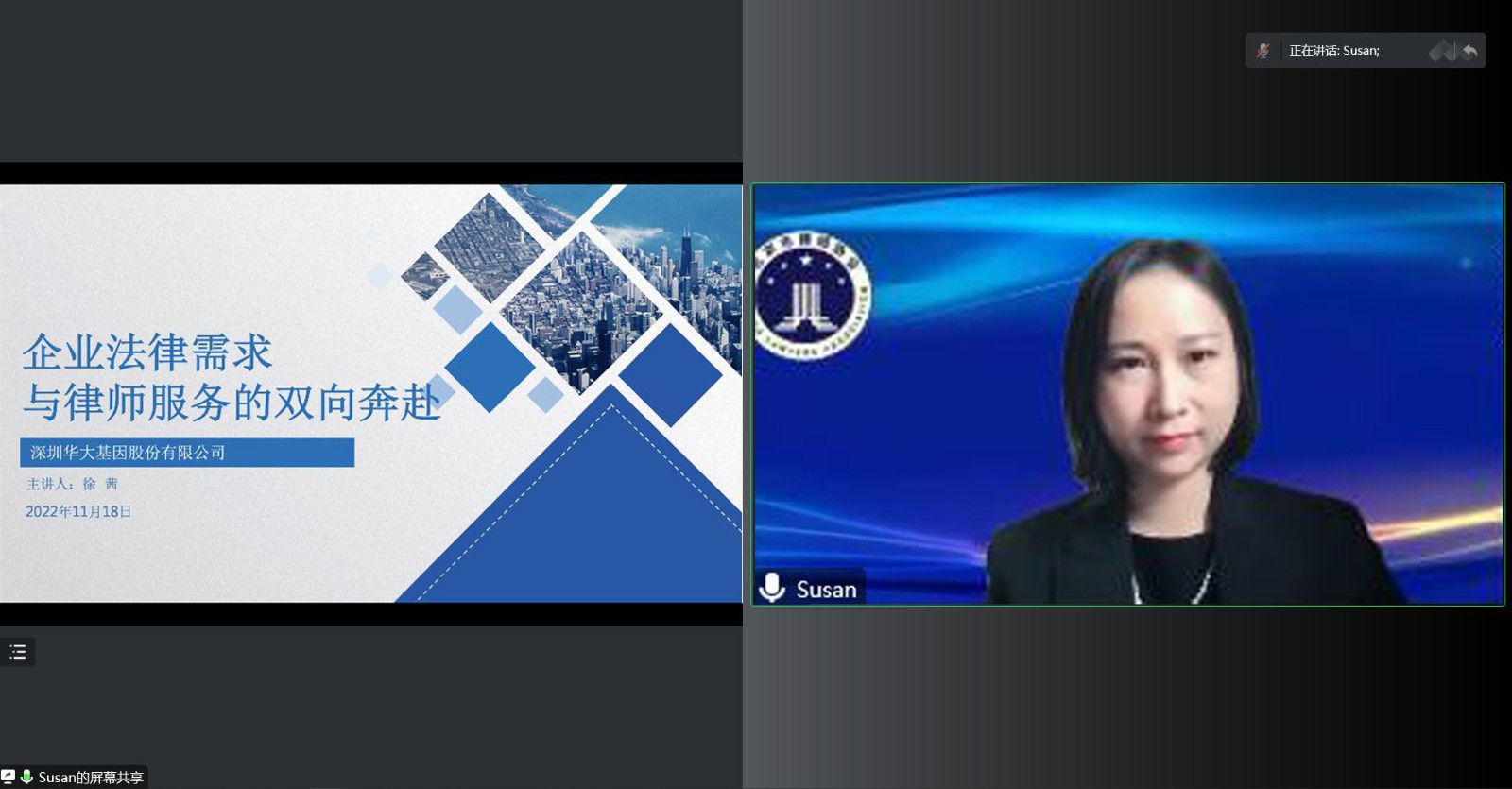 培训中,徐茜以《企业法律需求与律师服务的双向奔赴》为题,首先陈述了企业基础的法律服务需求,进而以其所在的华大基因公司为例,介绍了外部律师如何通过分析客户的业务类型、行业定位、覆盖领域等要素来了解客户更多的法律服务需求,最后分享了公司法务选聘外部律师和外部律师与公司合作时的注意事项。