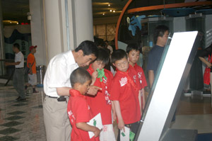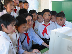 李大进会长和孩子们在教室里亲切交谈 “这个大家伙就是电脑呀!”
