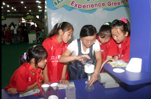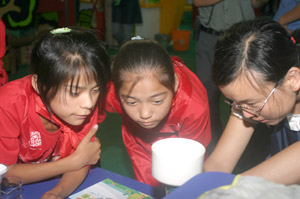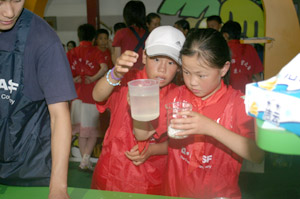 看讲解员做实验 “小心,水不能放多了”